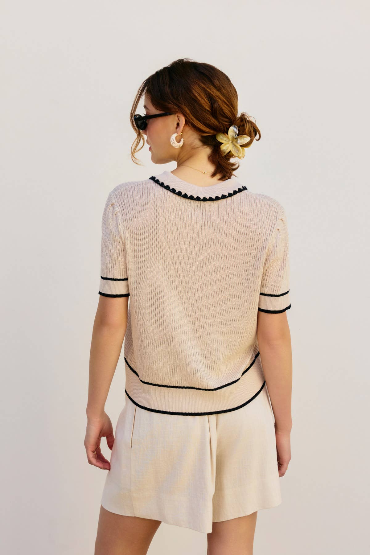 Open knit short sleeve top with contrast trim. Collared - Button down closures