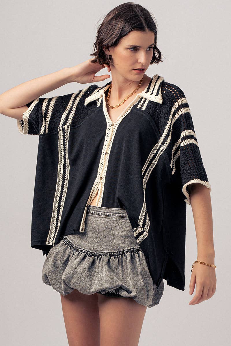 Crochet Lace Button-Down Shirt with Contrast Trim Detail