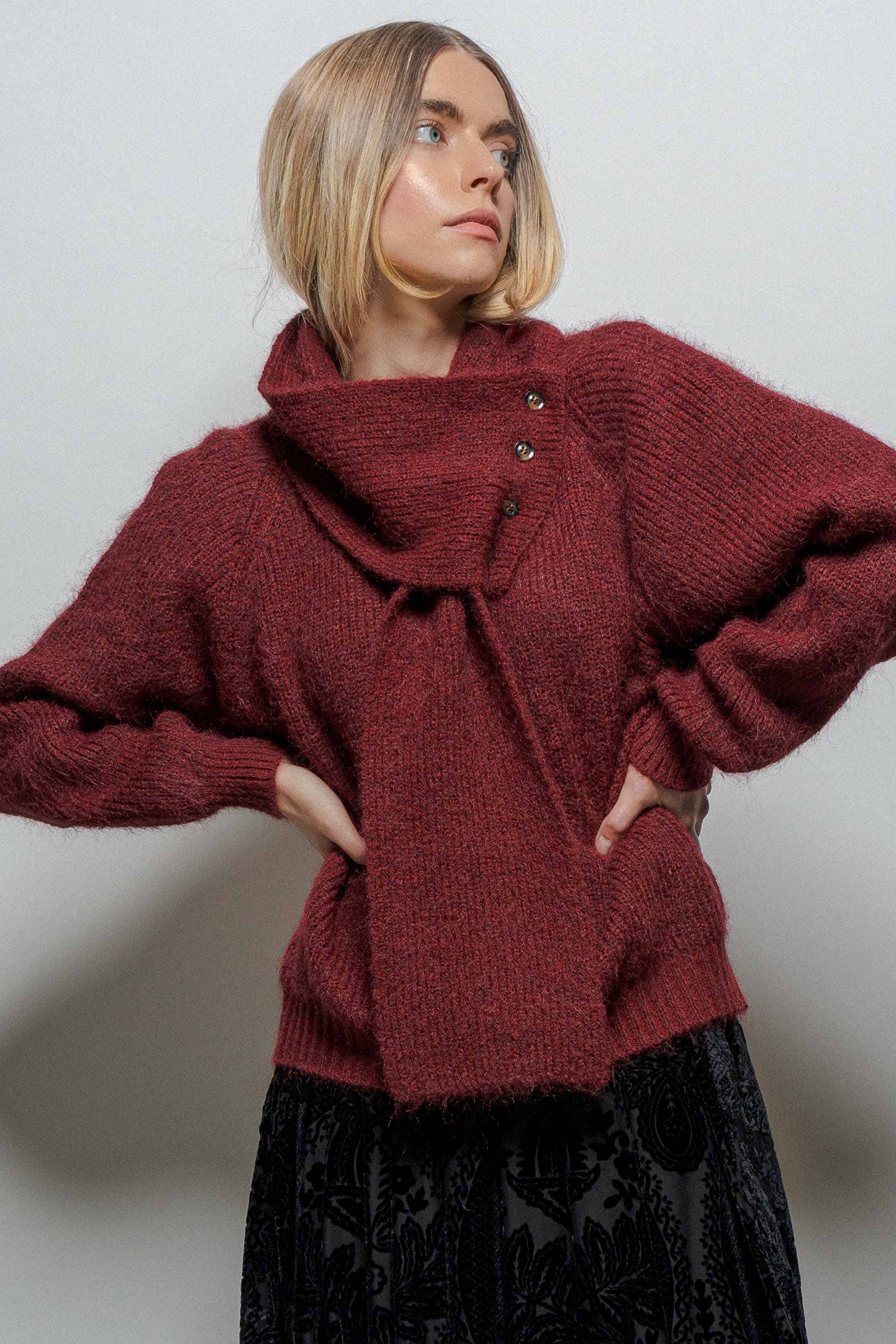 This cozy ribbed knit sweater features a stylish button neckline and detachable scarf detail, offering versatile looks for any outfit. With a relaxed fit and soft texture, it's perfect for layering over denim or pairing with skirts for fall and winter. Features: • 75% Polyester, 13% Polyamide, 8% Wool, 4% Spandex • Detachable scarf neckline • Ribbed knit texture • Soft stretch fabric blend • Relaxed, oversized fit for easy layering