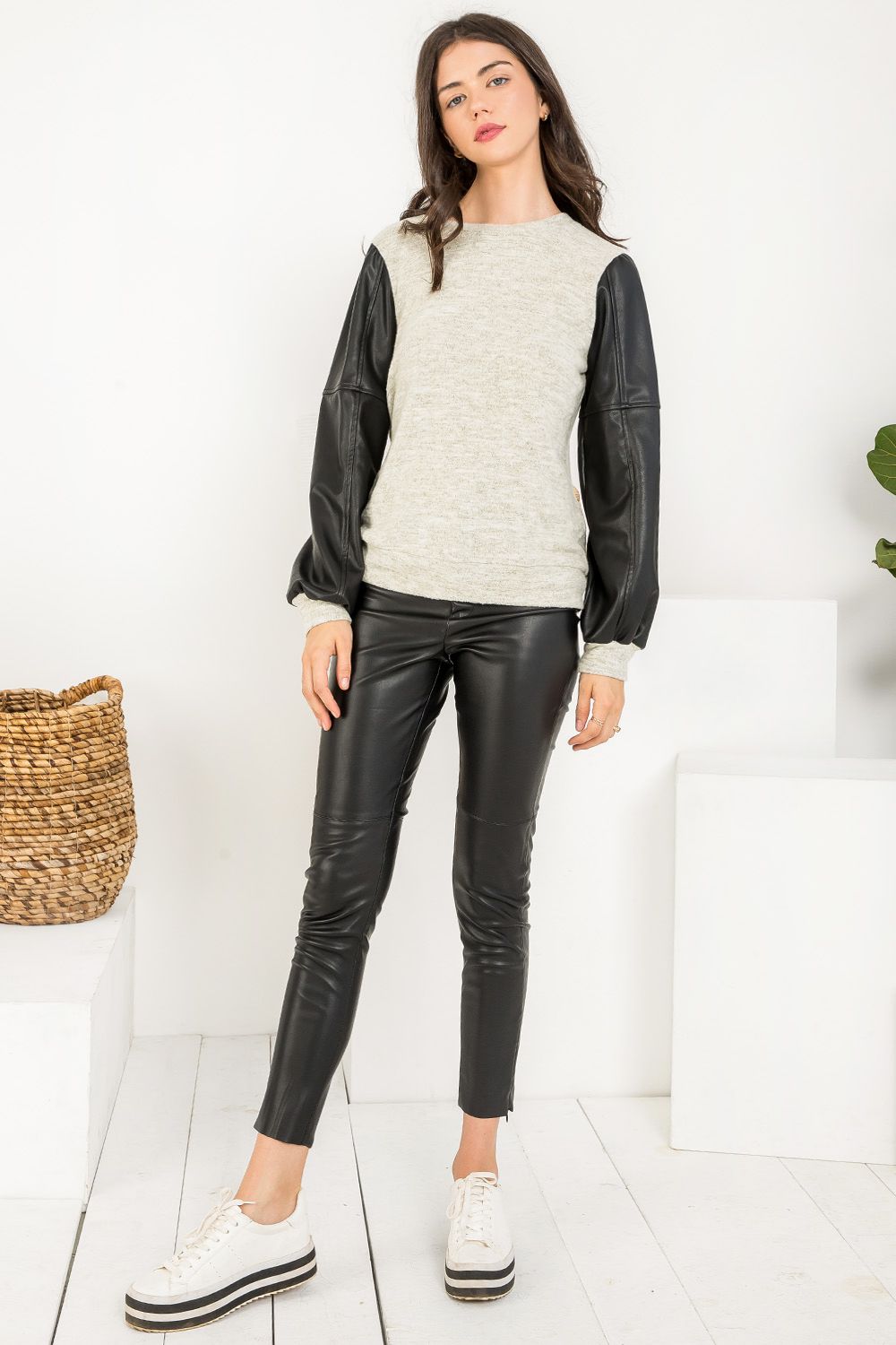 Stunning knit top with faux leather long sleeves. Knit crew neck, cuffs, and hem. Can be worn casual or dressed up. Design by THML.