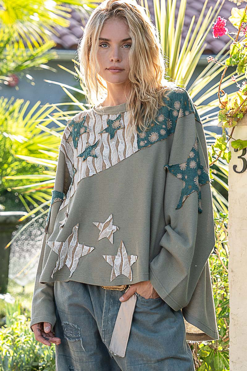 Designed in round neck long sleeve roomy fit top in thermal with star patch detail.