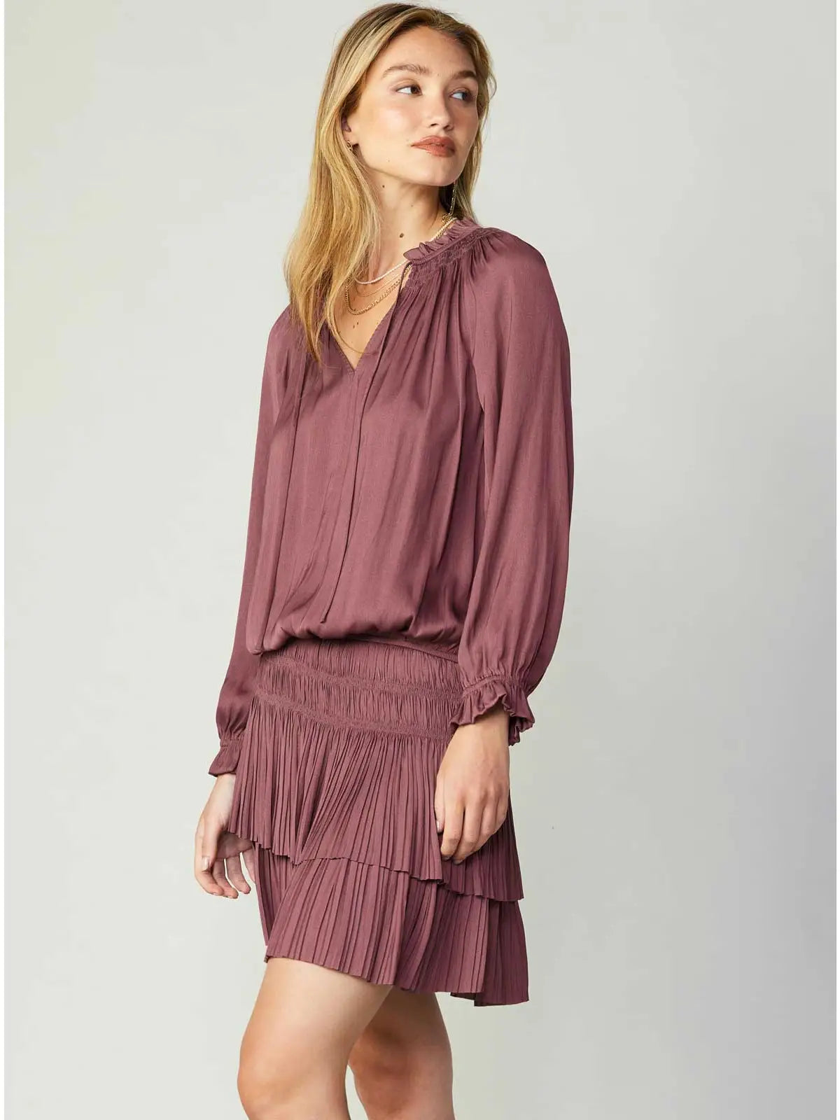 Women’s contemporary pleated long-sleeve mini dress.