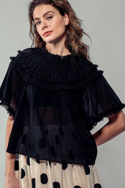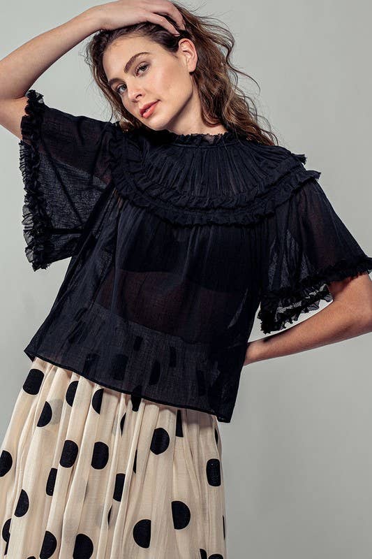 SHORT SLEEVES MOCK NECK LINE BACK BUTTON KEYHOLE CLOSURE RUFFLED EDGES