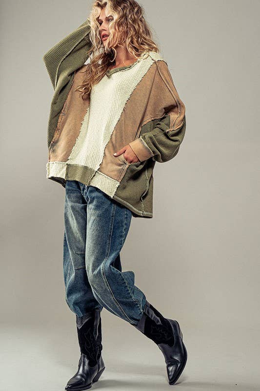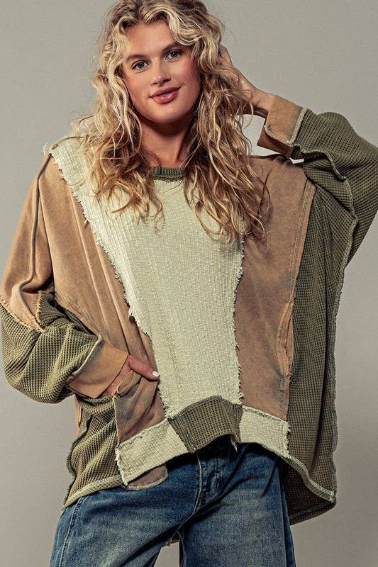 Texture Blocked Crewneck Sweater with Raw Trim and Waffle Knit Sleeves