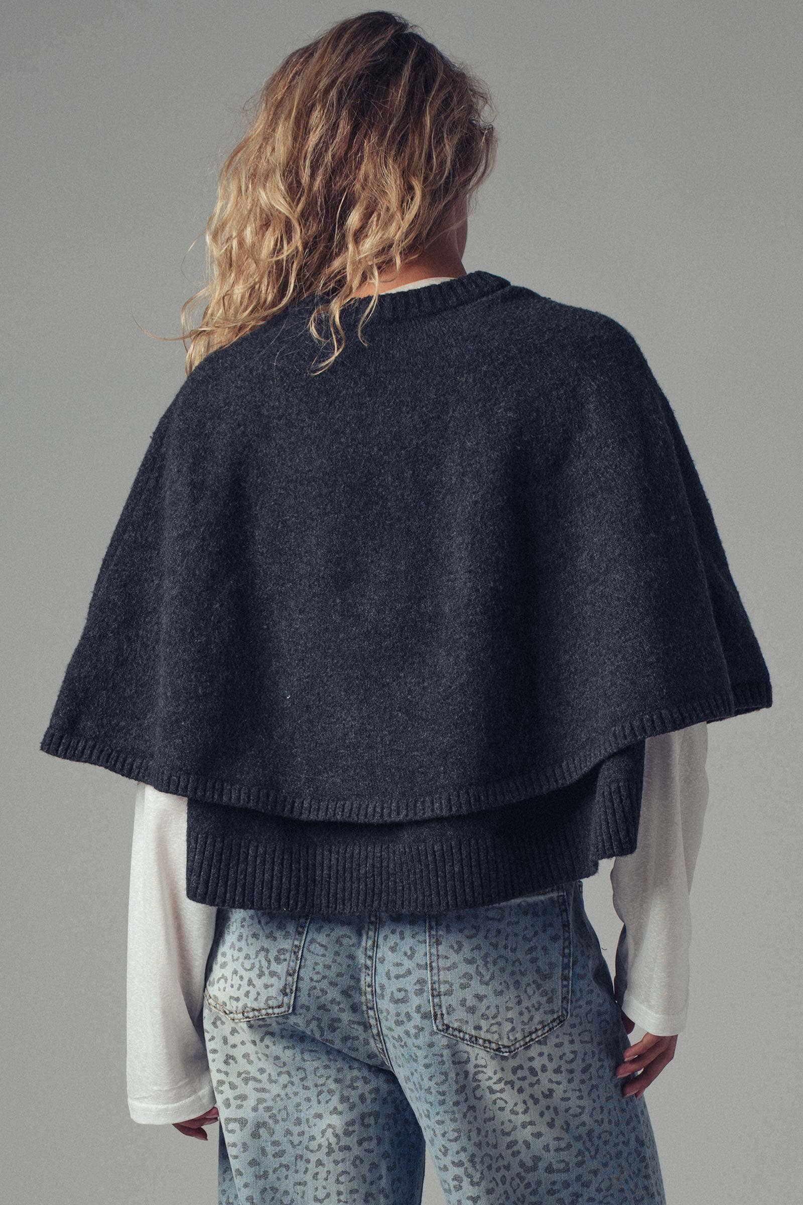 This cozy sweater cape offers effortless style and warmth, perfect for layering on cool days. The button-front closure and soft wool blend create a luxe drape, while generous arm openings make it easy to wear over dresses or tops.